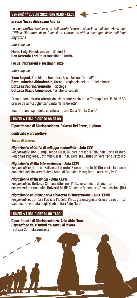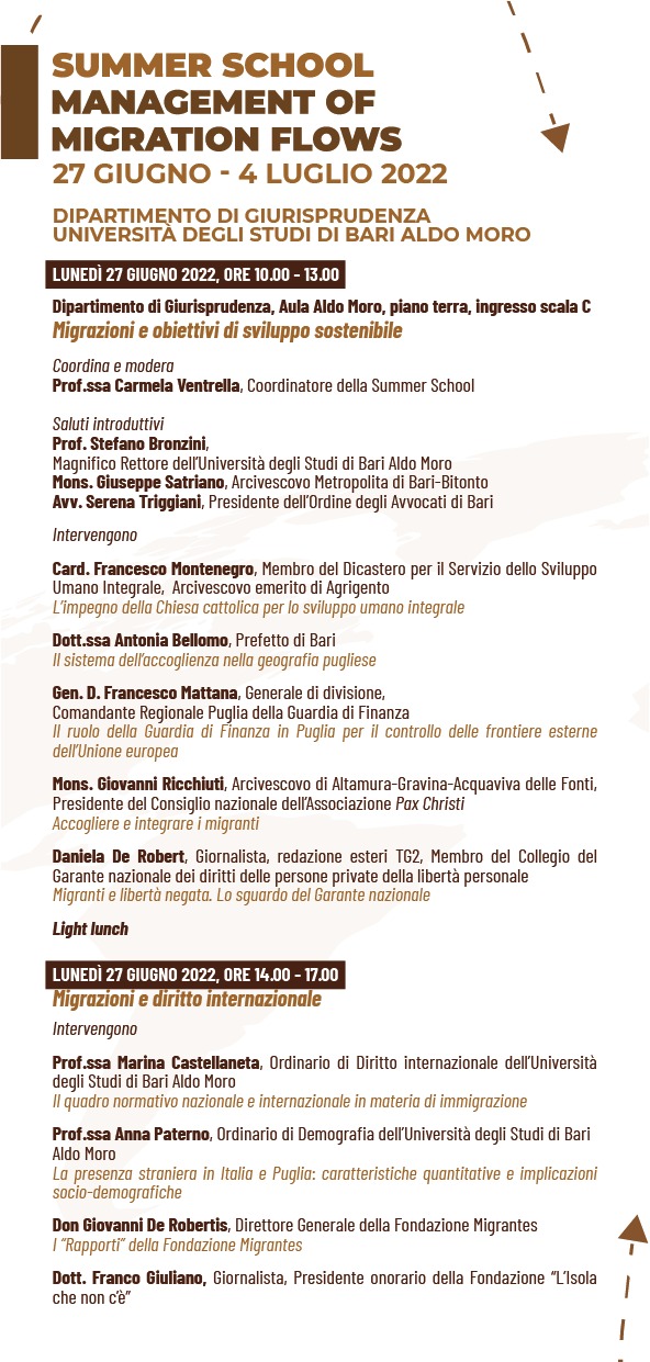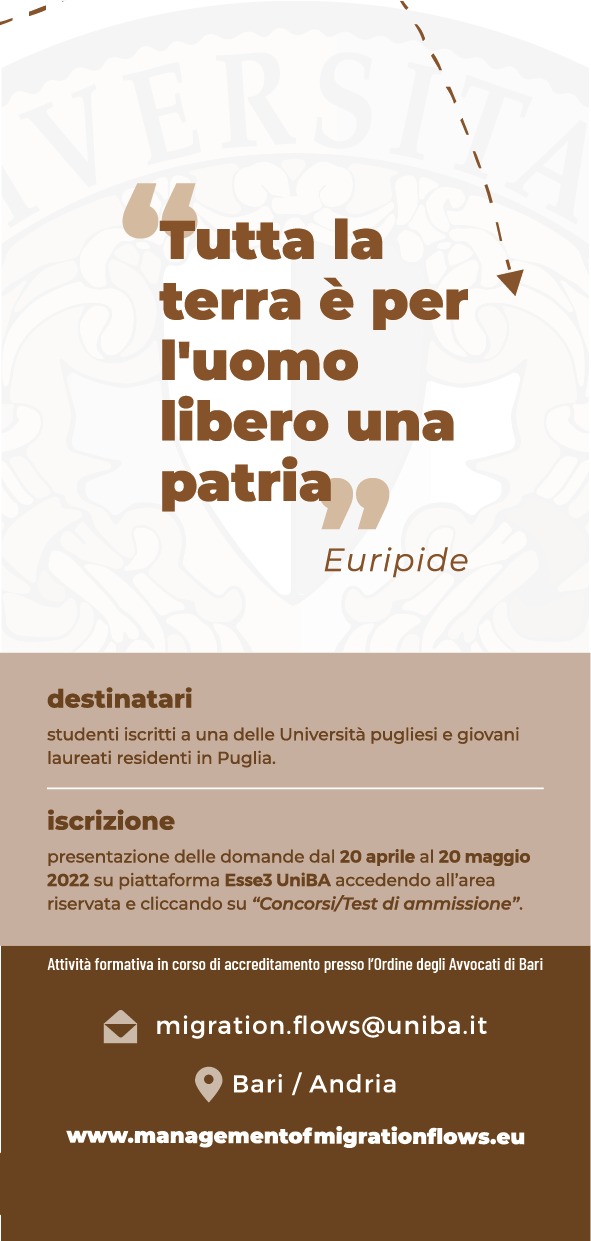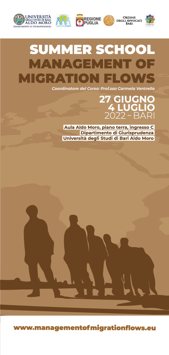 Il Dipartimento di Giurisprudenza dell’Università degli Studi di Bari Aldo Moro presenta la prima edizione della Summer school “Management of migration flows”, cofinanziata dall’A.Di.S.U. Puglia, in partnership con la Regione Puglia, il Garante dei diritti del minore, l’Ordine degli Avvocati di Bari e la Cooperativa Sociale e di Solidarietà – Impresa Sociale “Migrantesliberi” di Andria.