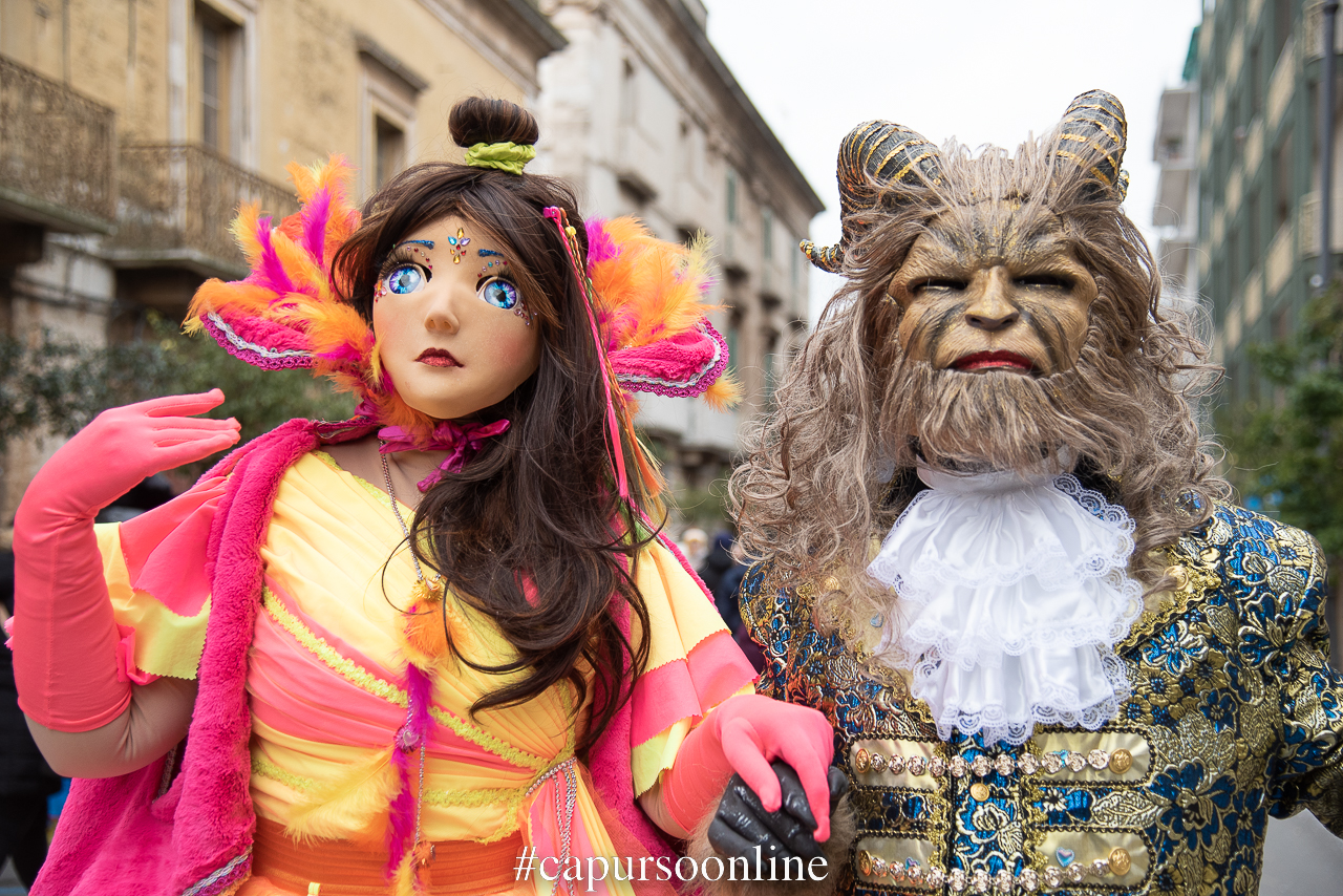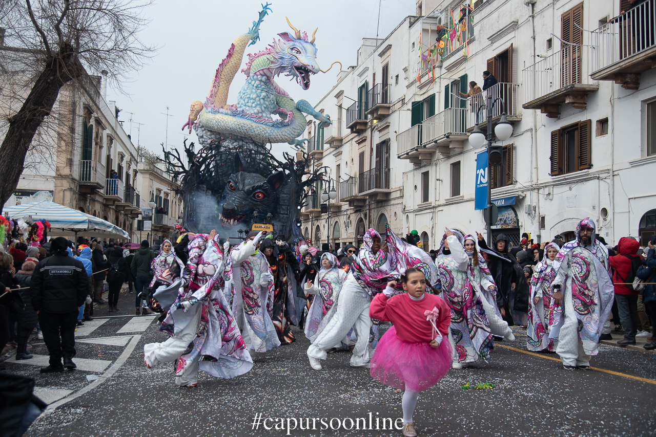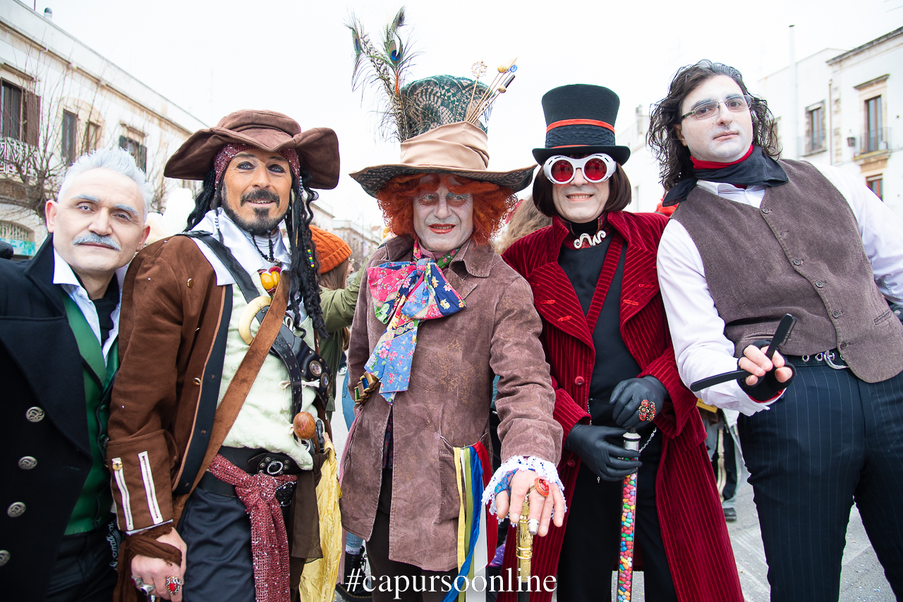 Molto numerosi i gruppi mascherati dedicati al mondo di Alice, alla fiaba del Ranocchio, alla Sirenetta e all’immancabile lupo cattivo portati in parata da scuole e associazioni di Putignano.