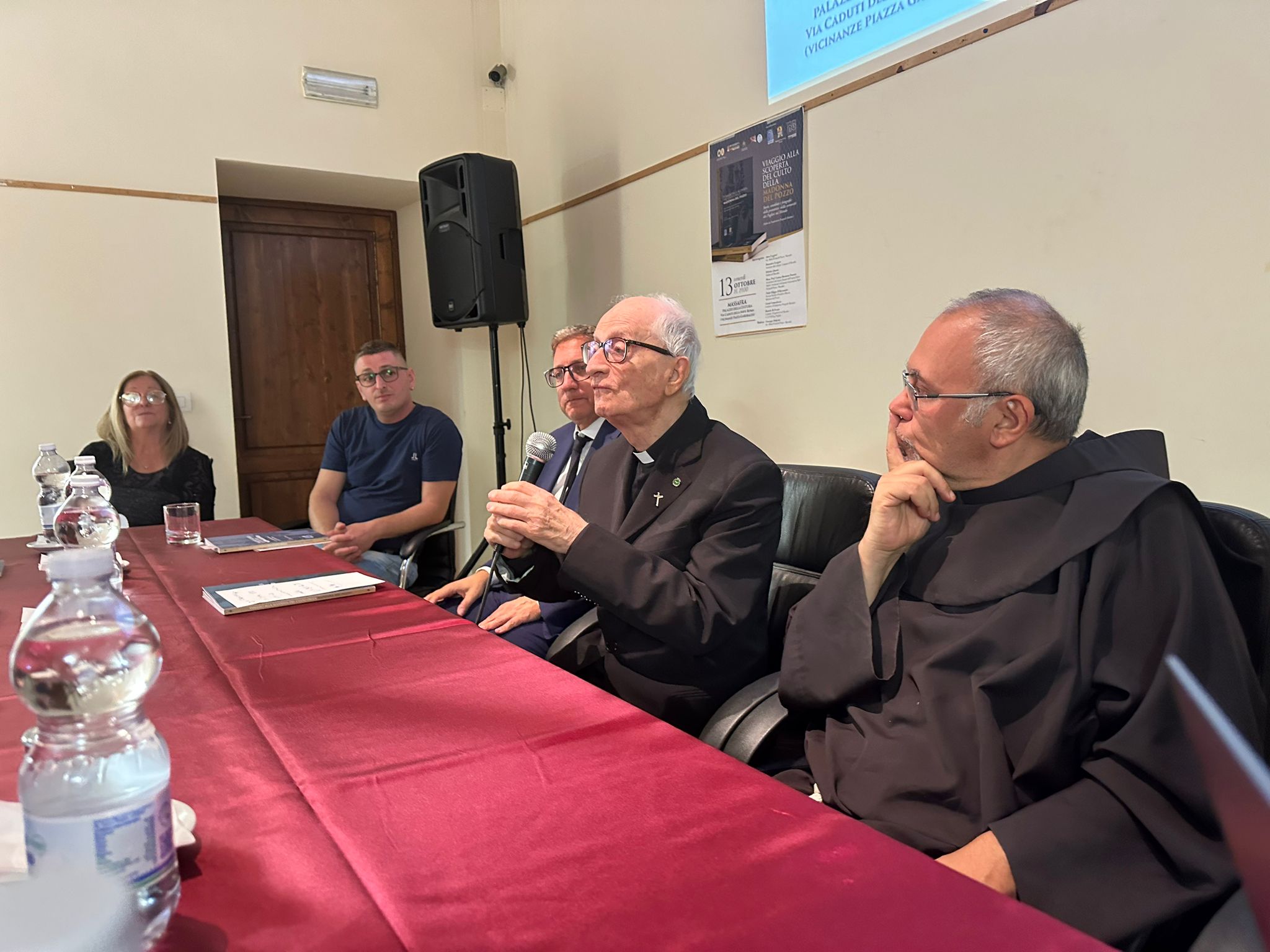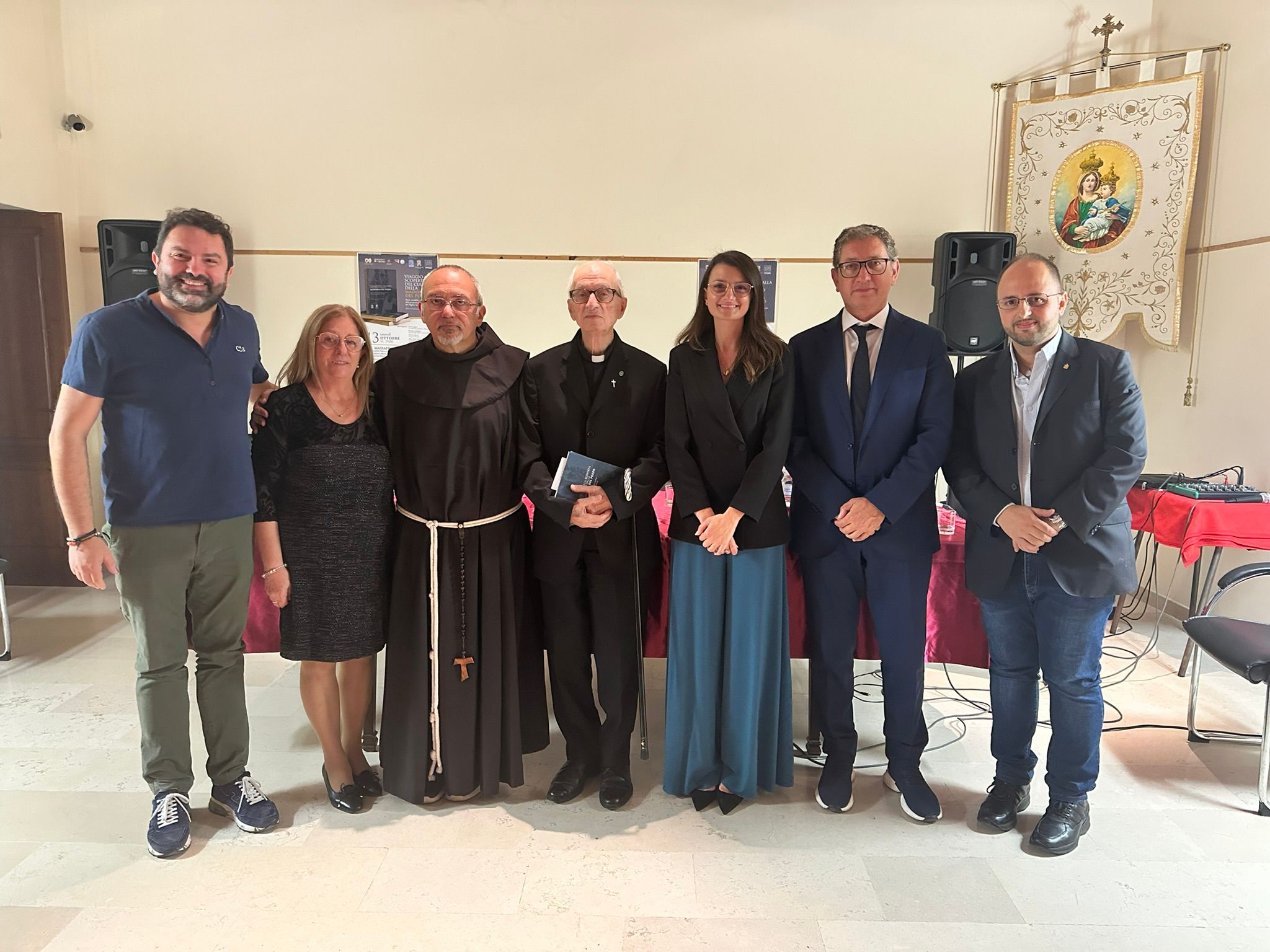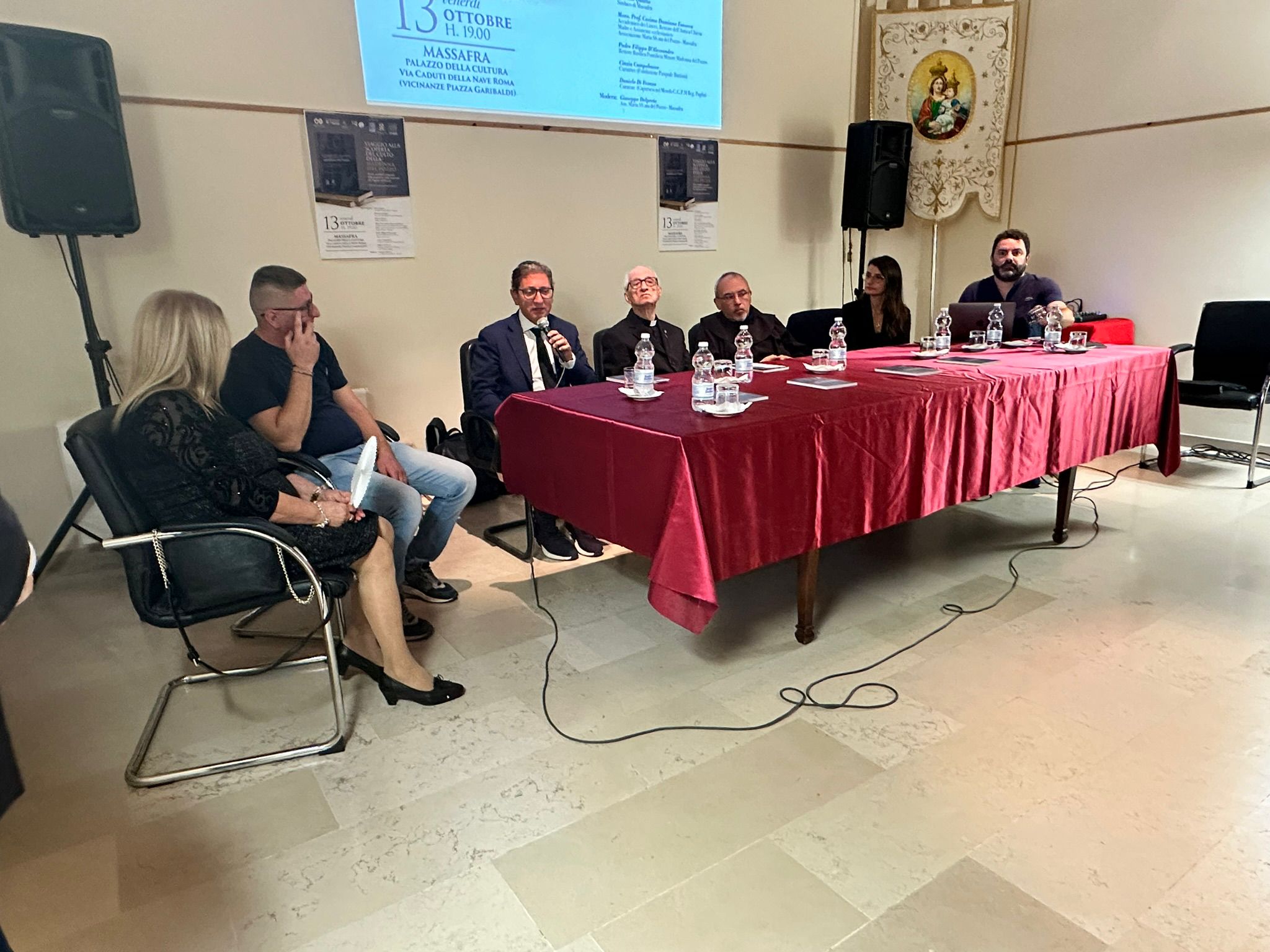 Massafra: Palazzo della Cultura. E’ stato presentato venerdì 13 ottobre 2023 il volume “Viaggio alla scoperta del culto della Madonna del Pozzo. Storie, aneddoti e fotografie della Protettrice della comunità dei Pugliesi nel Mondo” edito da Fondazione Pasquale Battista di Triggiano (Ba).All’incontro, organizzato dall’Associazione Madonna del Pozzo di Massafra (Ta), con la collaborazione della Rettoria dell’Antica Chiesa Madre, presso il Palazzo della Cultura di Massafra, sono intervenuti il Sindaco di Massafra, Fabrizio Quarto, Anna Leggieri, Presidente dell’Associazione Madonna del Pozzo di Massafra, il Mons. Prof. Cosimo Damiano Fonseca, socio dell’Accademia dei Lincei nonché membro dell’Associazione, Fra Filippo D’Alessandro, Rettore della Basilica Pontificia Minore Madonna del Pozzo di Capurso e i curatori del libro, Cinzia Campobasso (Area Ricerca e Sviluppo della Fondazione Pasquale Battista) e Daniele Di Fronzo (Capursesi nel Mondo e Consigliere Generale Pugliesi nel Mondo della Regione Puglia).